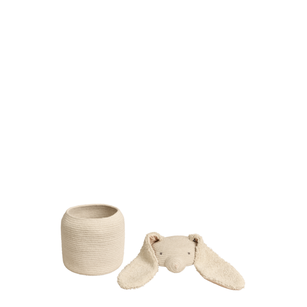 Een ovaalvormige mand in natuurlijke kleur, handgemaakt met gevlochten koorden van vezels uit gerecyclede PET-flessen gemengd met ons katoen. Met extra lange, zacht getufte oren en een afgeronde neus is Rita het konijnenmandje afgewerkt met een grote katoenen pompon als staart.