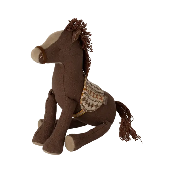 De bruine pony is gemaakt van een zachte katoen/linnen stof. De manen en staart zijn van katoenen touwtjes en het zadel is gemaakt van zachte gebreide stof die garandeert dat de rit comfortabel zal zijn.