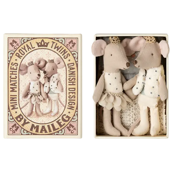 De koninklijke tweelingmuizen is een set van een kleine prinses en prins. Ze dragen gouden kronen en mooie kleren. Ze slapen in een mooi versierd luciferdoosje met een foto van henzelf op de voorkant. In het doosje vind je het zachtste beddengoed.