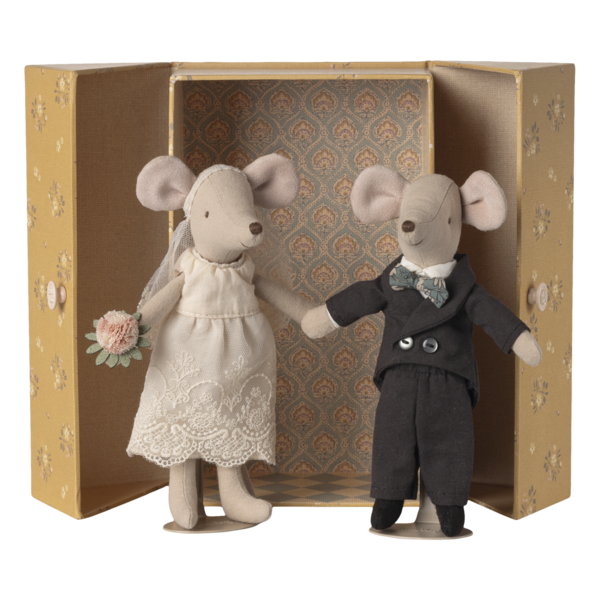 Een prachtig liefdesverhaal dat begint op de trouwdag van deze twee muizen. Ze zijn klassiek gekleed in een lange witte jurk, kanten sluier, boeket en smoking. Ze worden geleverd in een mooie doos versierd met Maileg-print.