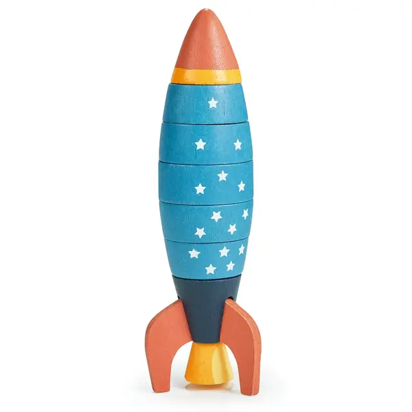 Een klassiek stapelringenspeelgoed waarbij zowel gestapeld als vormpjes in de juiste volgorde worden geplaatst om een kleurrijke raket te vormen. Als het correct in elkaar is gezet, staan de cijfers 5, 4, 3, 2, 1 van onder naar boven en heeft elke ring het bijbehorende aantal sterren op de achterkant gedrukt.