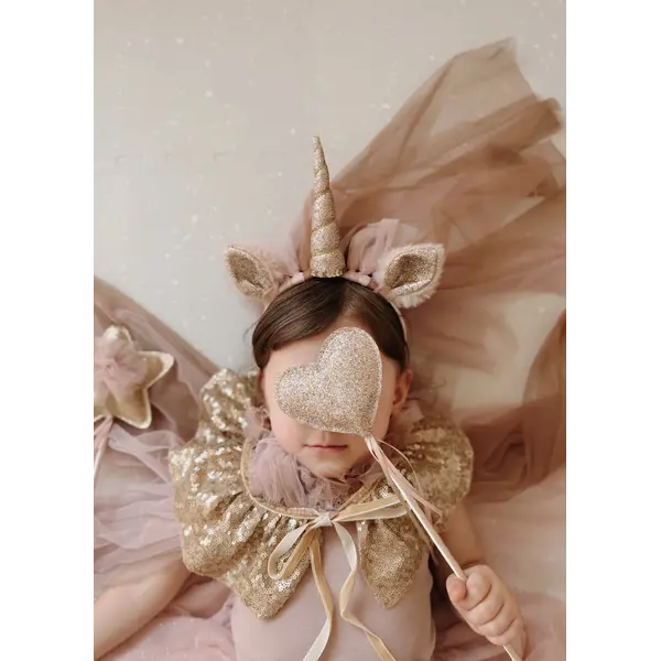 De set “My Little Unicorn” is het meest magische eenhoornkostuum dat je kunt vinden. De set bevat een eenhoornvormige hoofdband, een toverstaf en een cape, allemaal bedekt met glitters en glitters!