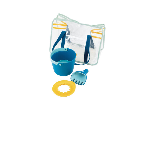 Binnen vind je drie strandbenodigdheden: een stevige emmer « Bucki », een schop en een hark 2 in 1 « Raki » en onze iconische zandvorm « Magic Shaper ». Alles wat kleine ontdekkingsreizigers nodig hebben voor creatief zandspel.