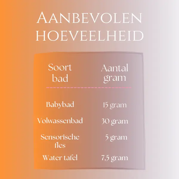 - Bewaaradvies: Sluit het zakje goed af. Bewaar op een koele (kamertemperatuur), droge plek tot je klaar bent om het badpoeder te gebruiken.