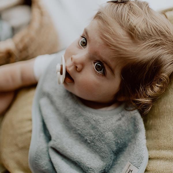 Praktische dubbellaagse slab Moon Blue in XL formaat, geschikt om kleding te beschermen. Gemaakt uit zachte, ademende dubbellaagse bamboe badstof en daarom extra absorberend en anti-bacterieel. Verstelbaar in twee verschillende standen met behulp van de twee drukknopen. Een mooie, zachte slab; ideaal voor baby's en peuters.
