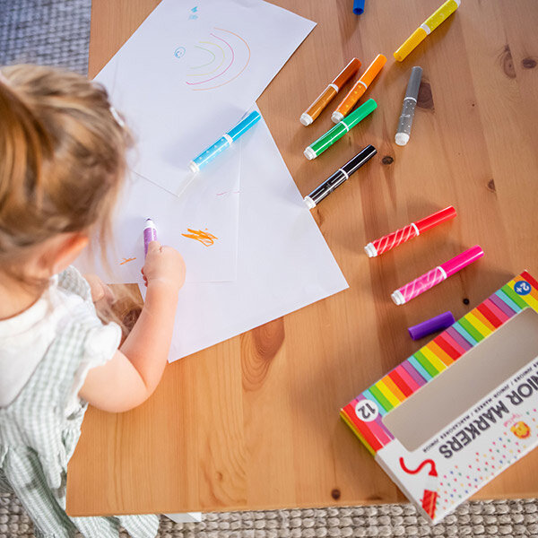 Met deze set van 12 uitwasbare stiften maken jonge kinderen kleurrijke tekeningen. Deze junior markers zijn speciaal ontworpen voor de allerkleinste handjes. Ze zijn niet giftig en uitwasbaar. Ideaal om de creativiteit te ontdekken terwijl de tanggreep en fijne motoriek geoefend worden.