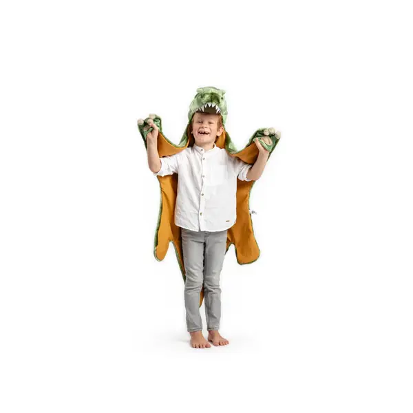 Ben je moe van een hele dag te spelen? Gebruik je t-rex-cape als een warm dekentje om even onder weg te dromen.